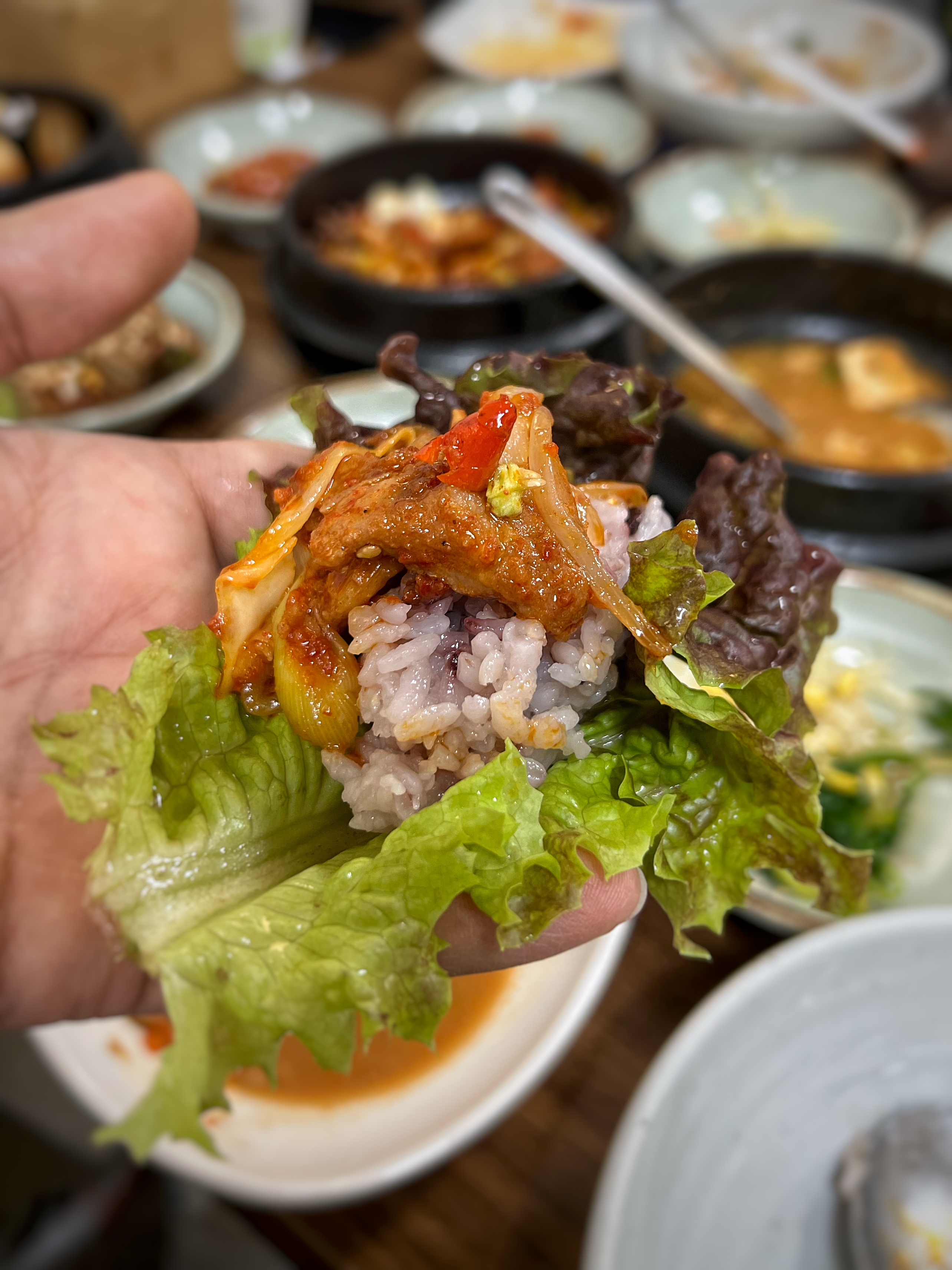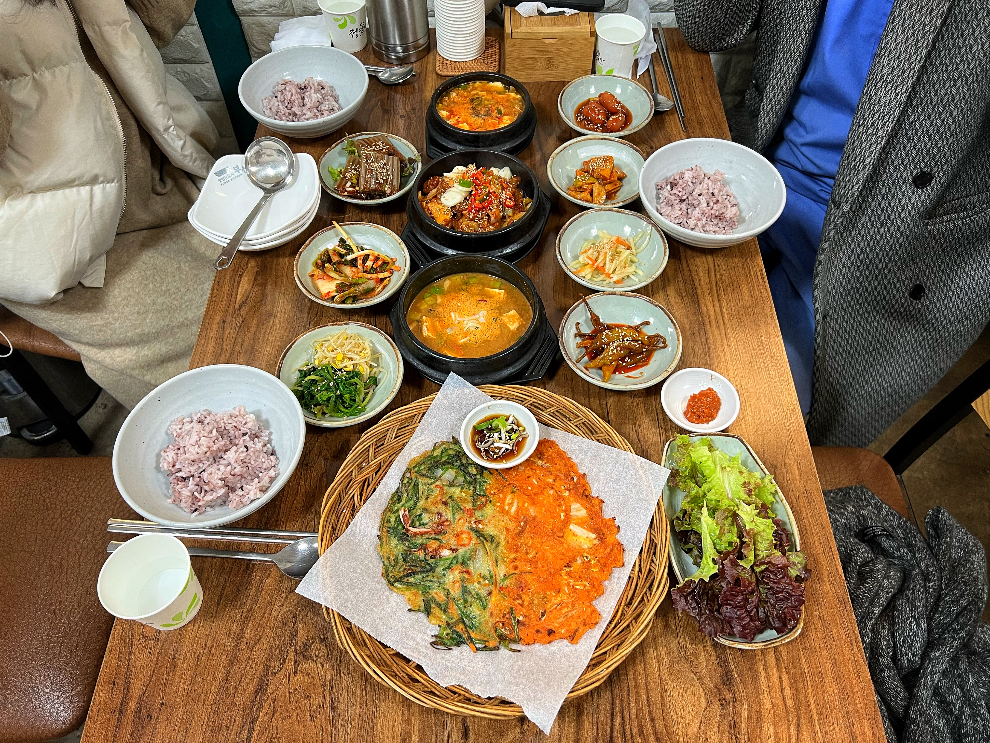 밥 한 공기는 두루치기와 쌈을 싸서 즐기고, 간간히 순두부를 곁들여준다. 두 번째 밥은 나물과 청국장을 함께 비벼서 먹으면 꿀맛이다.