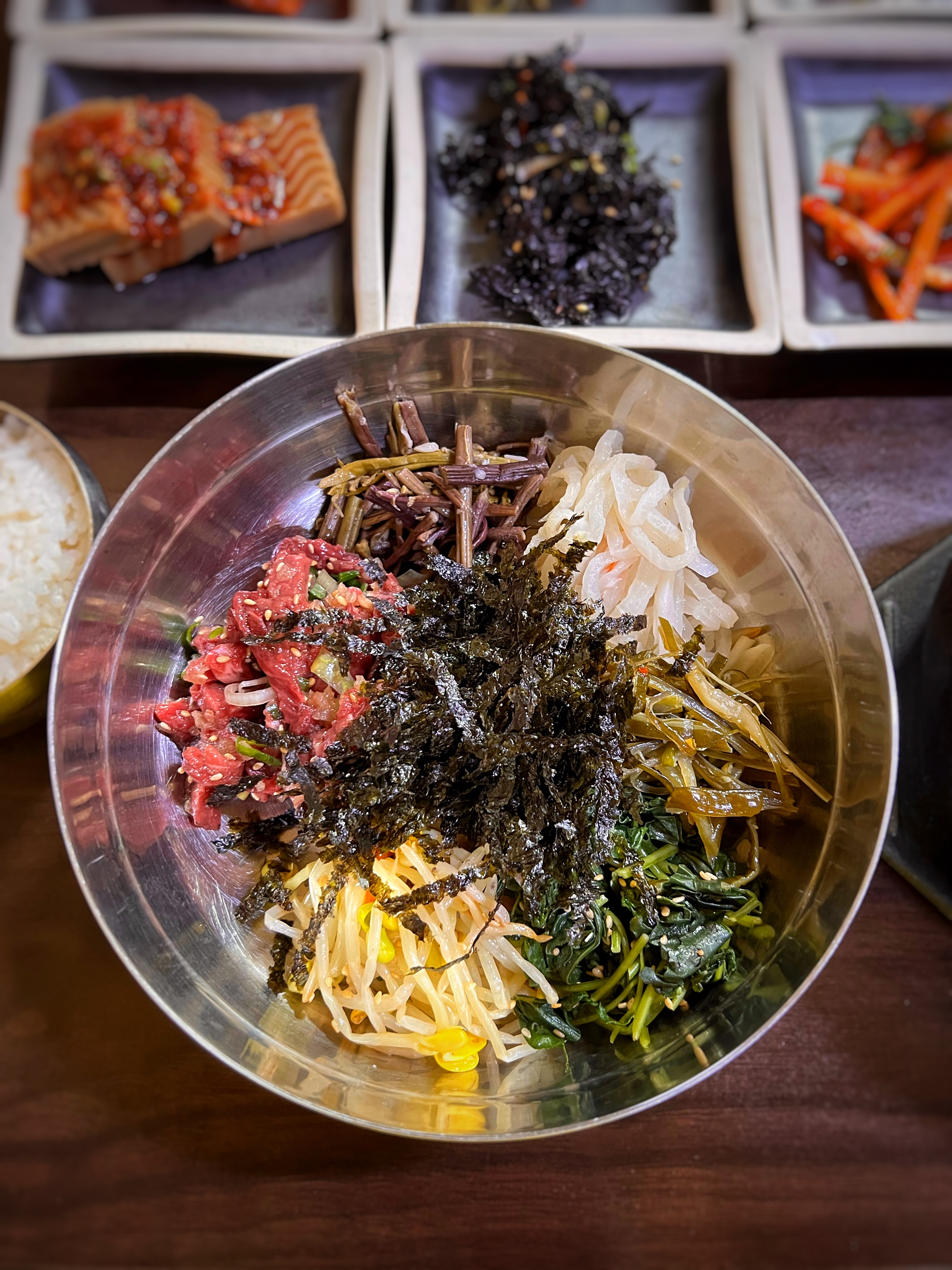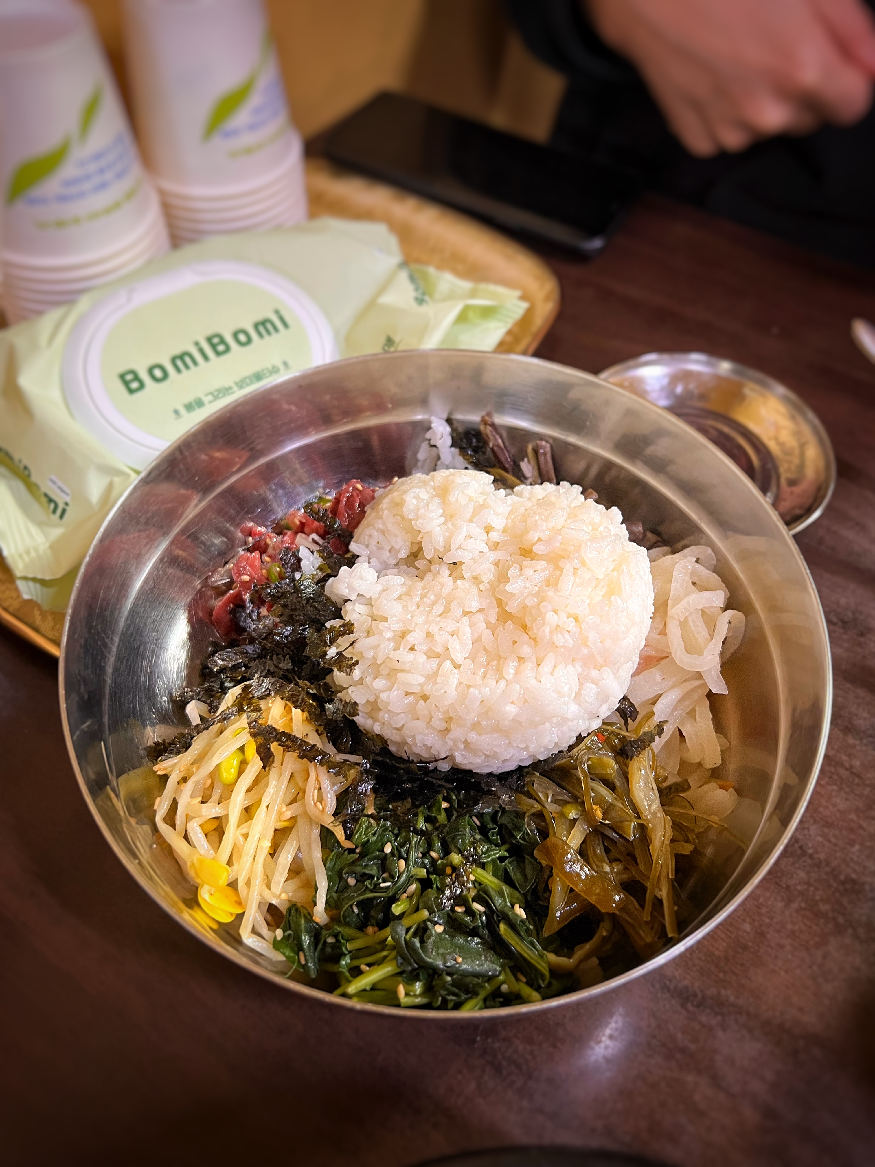 한우육회비빔밥은 대접에 다섯가지 나물반찬과 육회, 조미김을 담아주고 밥은 따로 내어준다. 메뉴를 보면 비빔밥도 있던데 7,000원이었다. 아마 육회의 추가여부에 따라 금액 차이가 나는 것 같다.