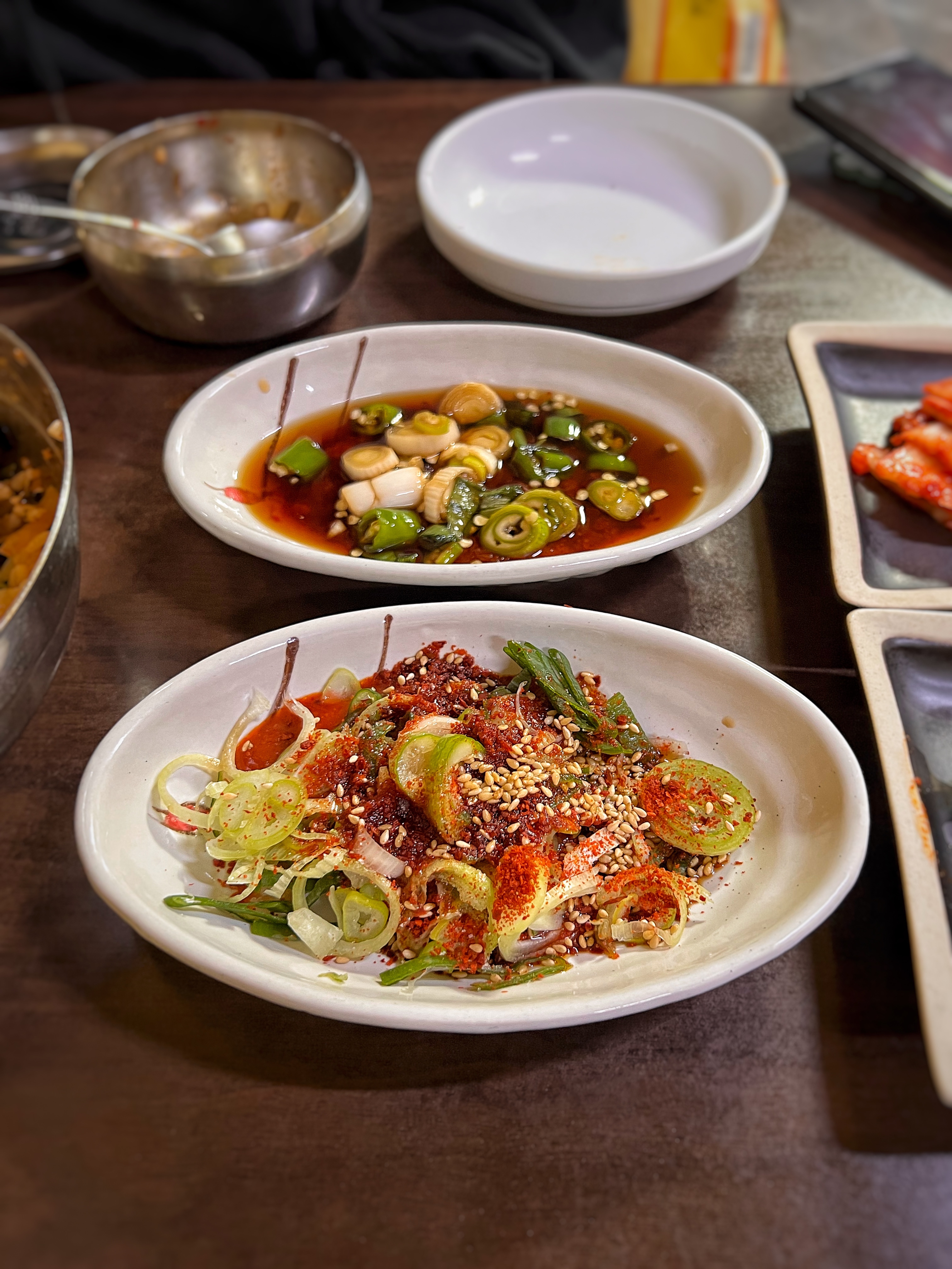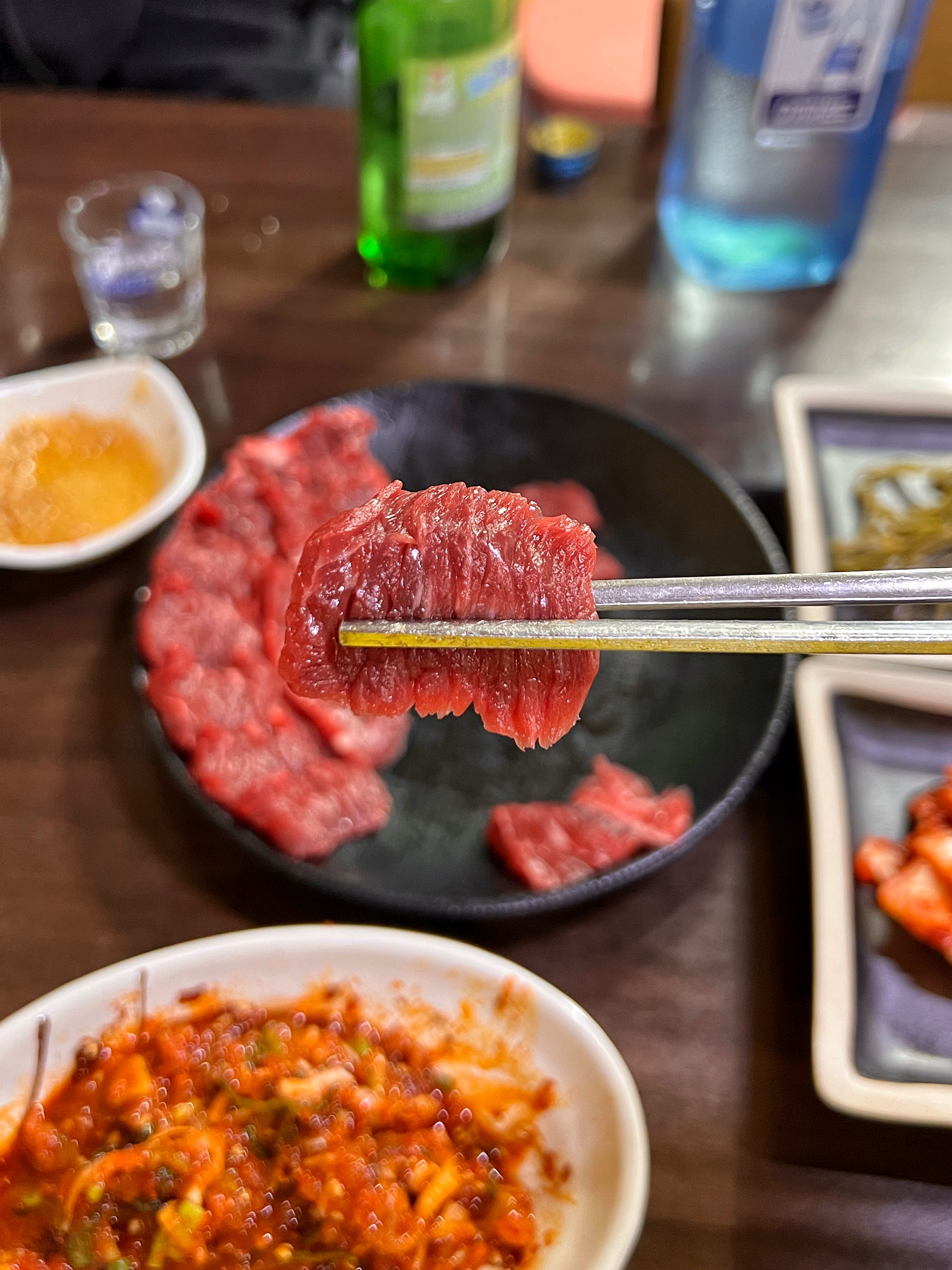 고기가 도착하니 양념장을 먼저 내어주더라. 양념은 두 가지로 고춧가루가 수북하게 뿌려진 양념과 간장베이스의 양념인데 단맛이 강한 게 경북식 뭉티기 양념과는 차이가 있었다.