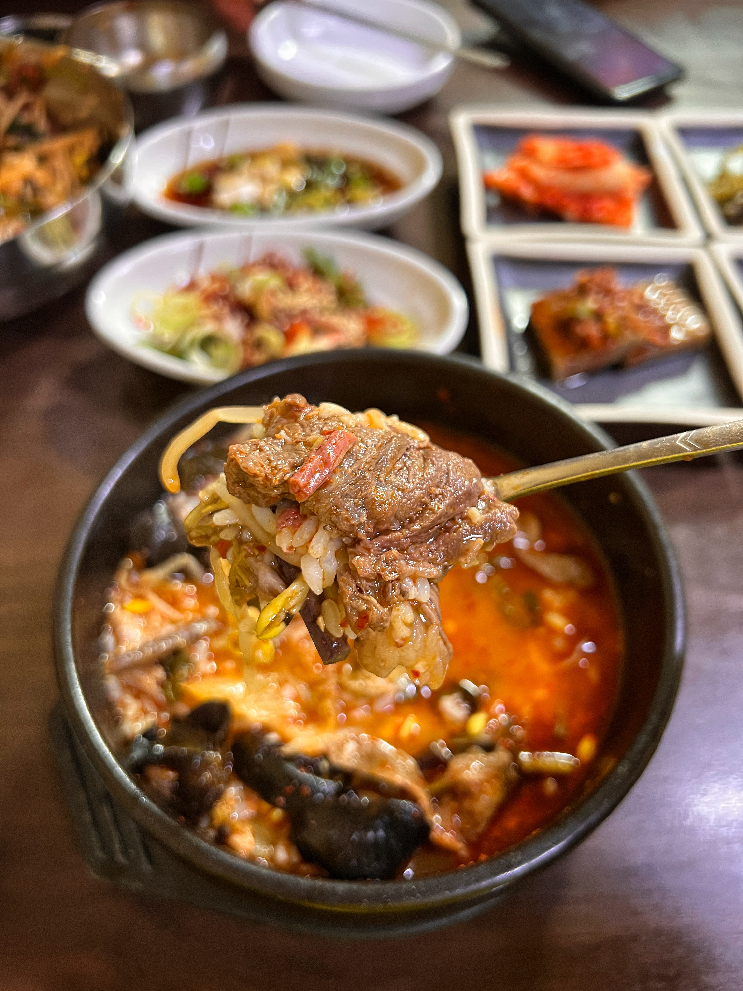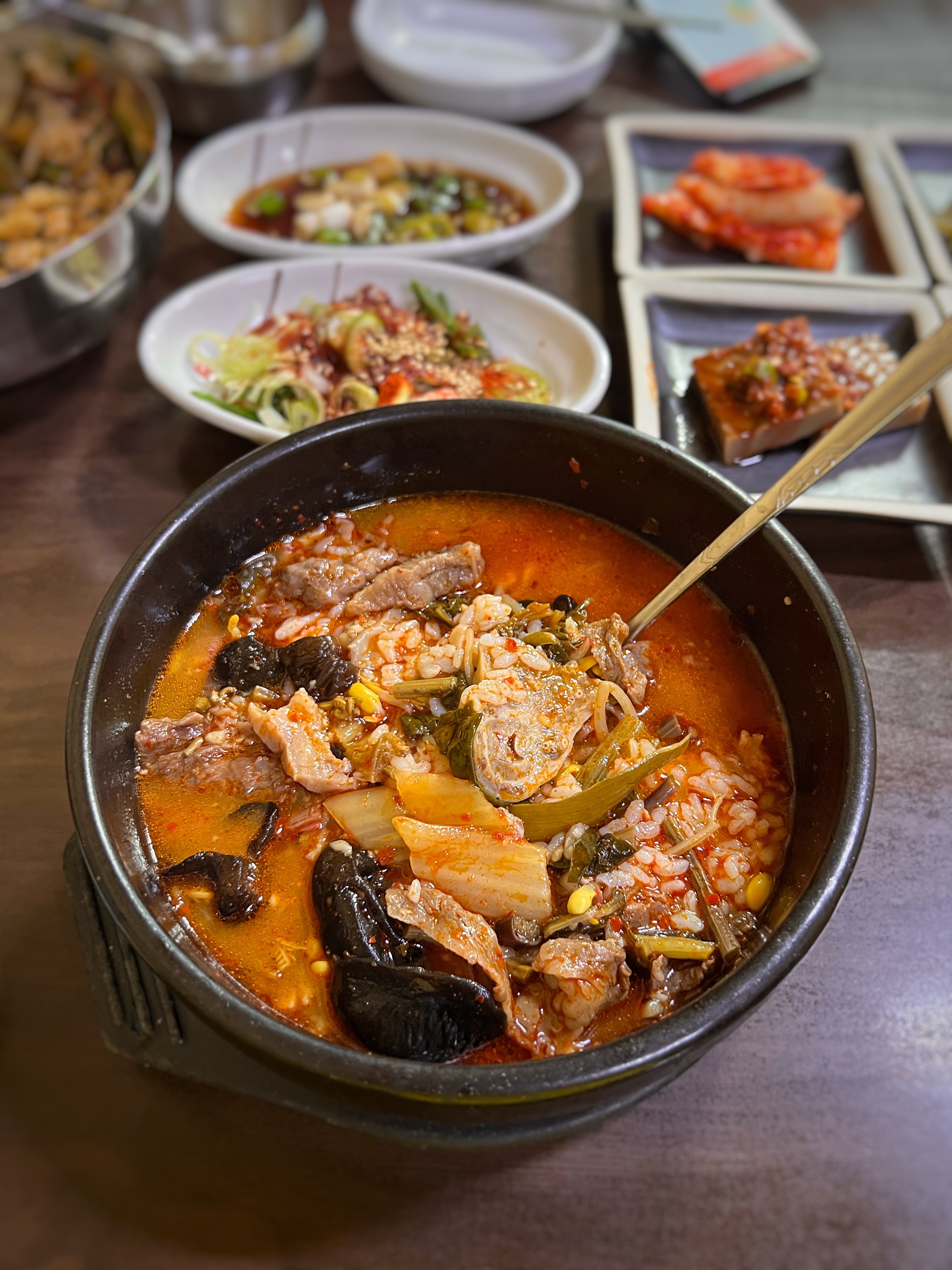 빨간 국물의 한우국밥. 뚝배기에 소의 머릿고기가 푸짐하다. 목이버섯도 들어갔던데 국밥에 목이버섯은 생소하다.
