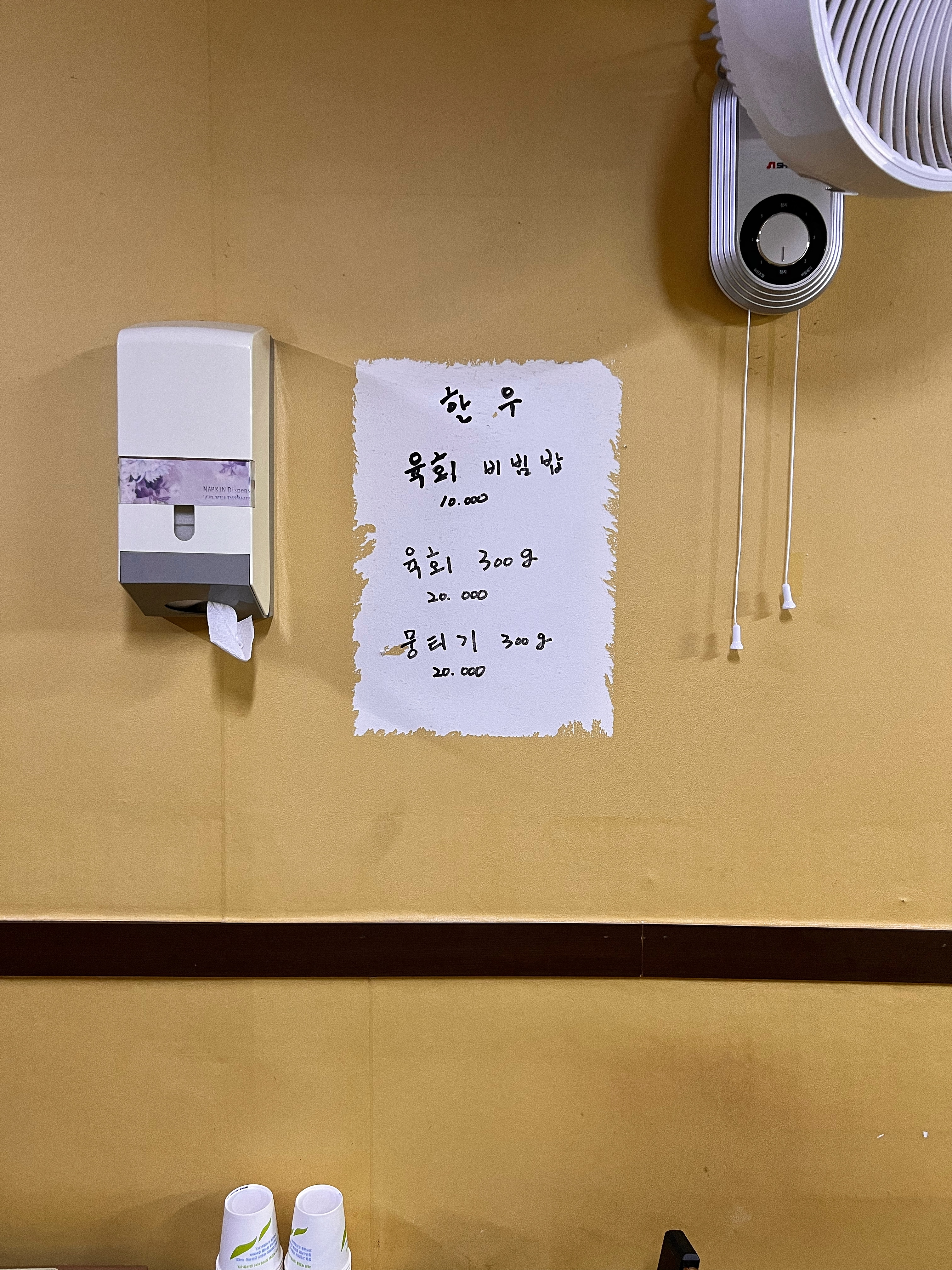 3시에 방문했는데 뭉티기가 아직 도착하지 않았다고 한다. 30-40분정도 기다려야 한다고 해서, 한우국밥과 육회비빔밥을 먼저 주문했다.