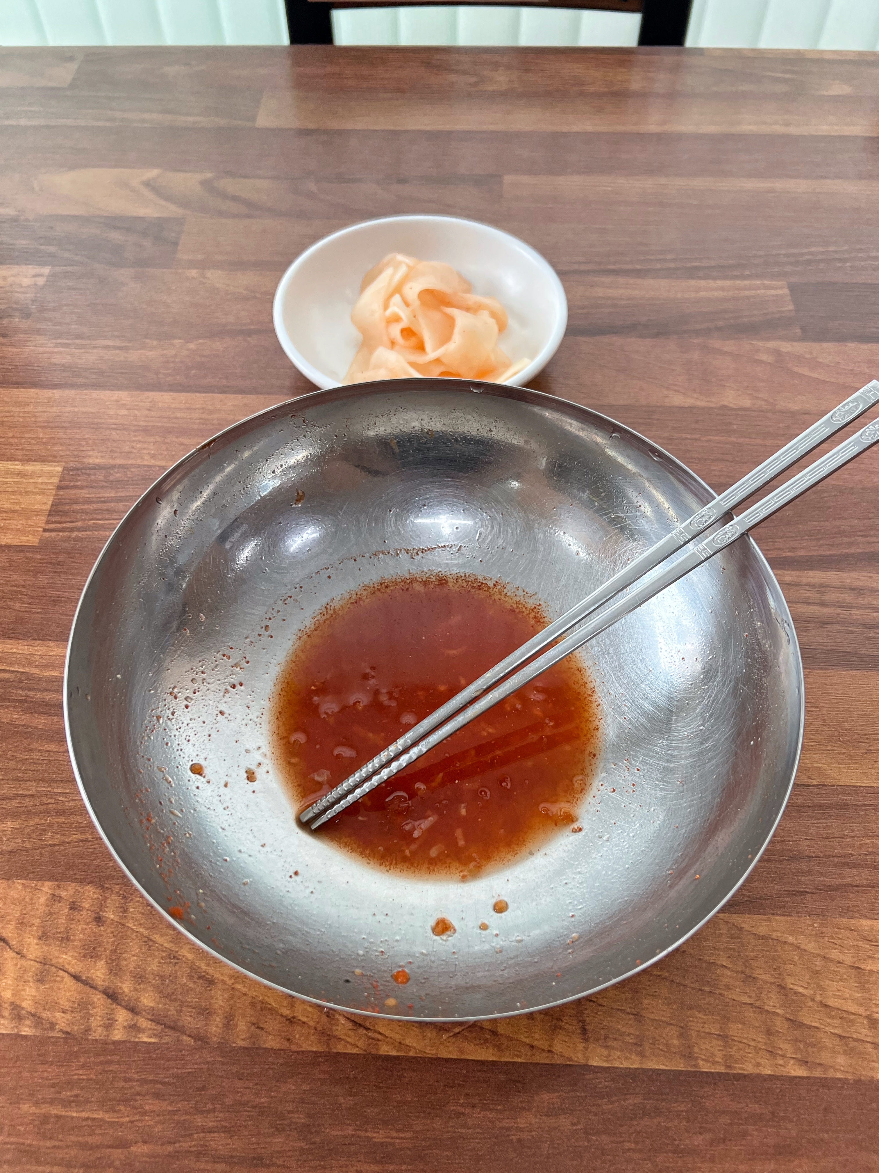 섞기 전에 국물 먼저 맛을 보고, 양념도 맛보고 면과 양념을 섞어주자. 반정도 남았을 때 면에 식초 한번 쳐 주고, 겨자를 풀어 먹으면 밀면의 변화를 맛볼 수 있다.