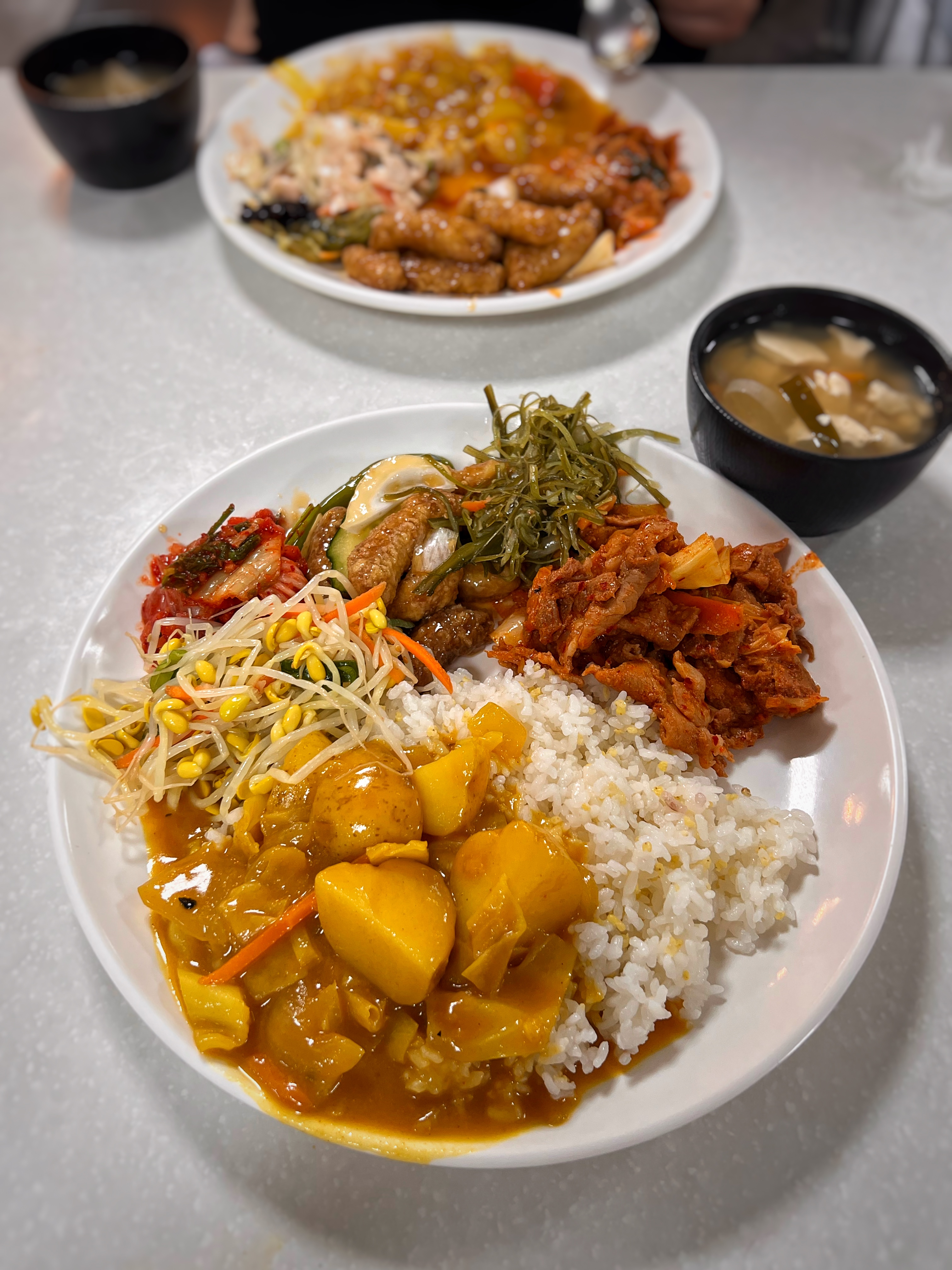 흑미밥 / 백미밥 소고기맑은곰탕 철판제육볶음 삼색나물 & 약고추장 간장비빔국수 소세지야채볶음 반달오이무침 양배추샐러드 반찬류 김치 |