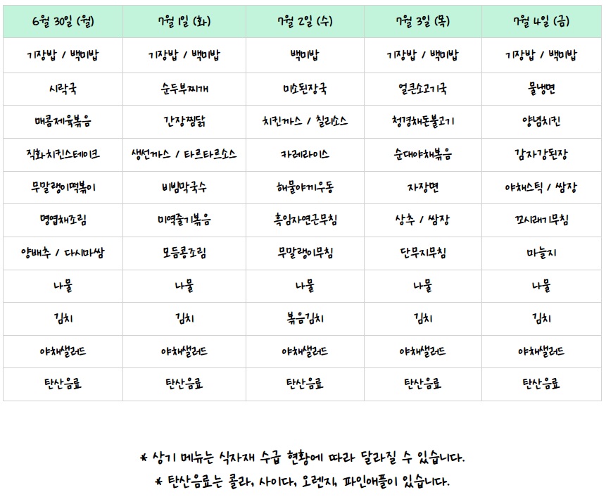 2. 다와푸드 큐비점 7월 첫째주 주간 식단표
