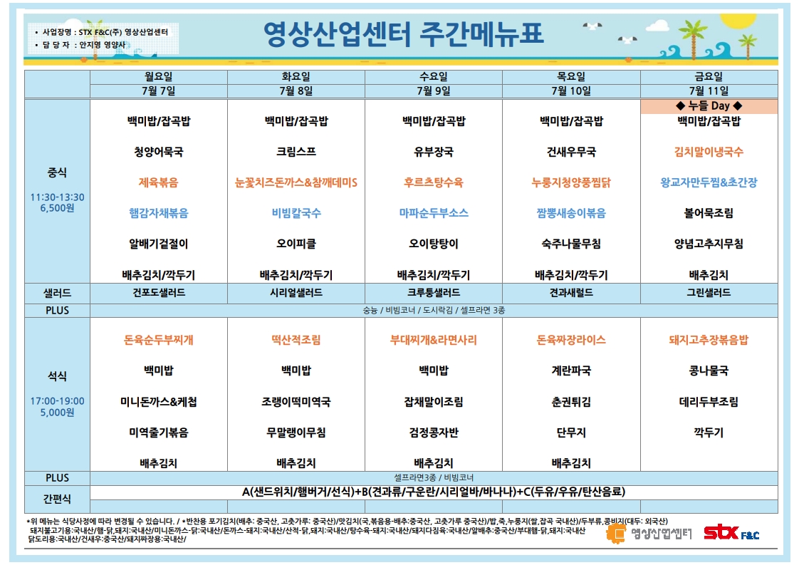 1. 영상산업센터 7월 둘째주 주간 메뉴표
