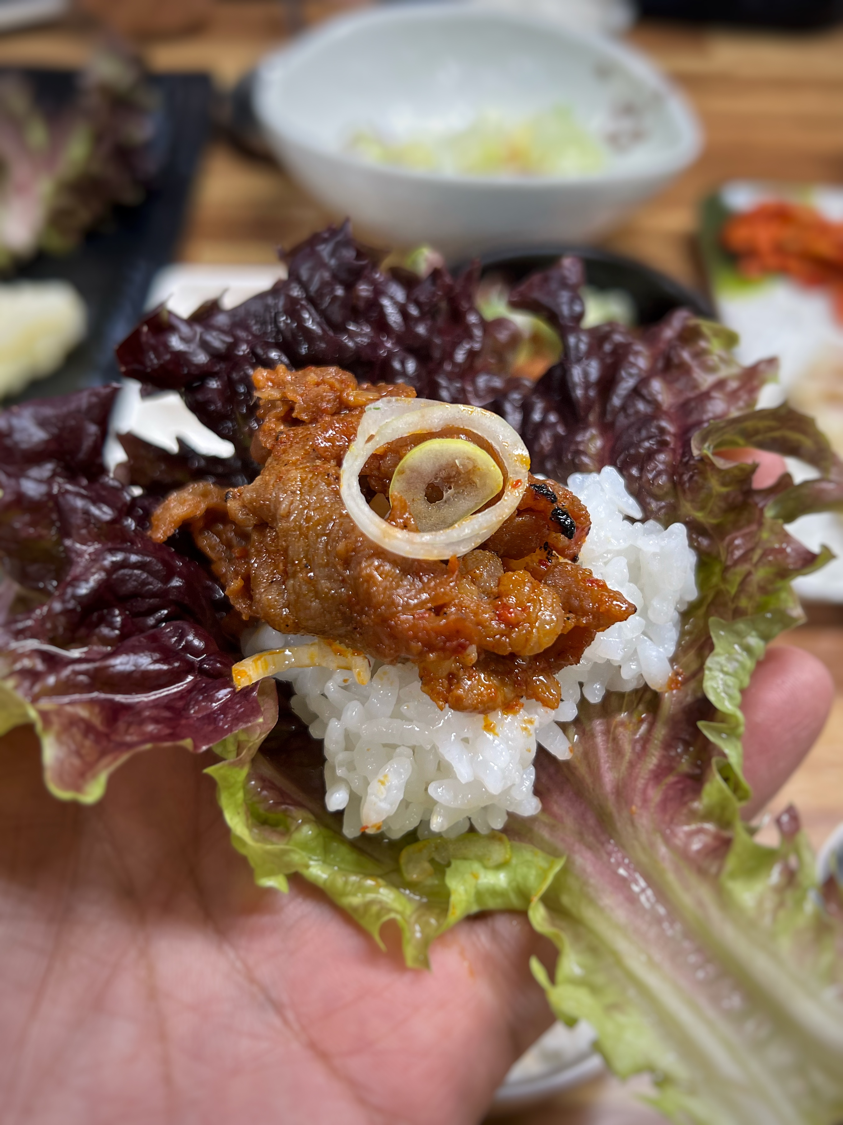 불향이 은은한 제육볶음은 상추 위에 밥과 함께 올려서 싸먹는 게 제맛이다.